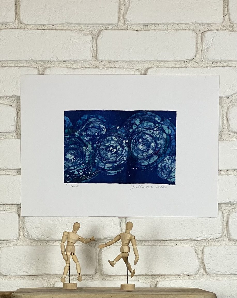 ” Prawda o Kosmosie „- inspiracja głębią i kolorem kosmosu. Batik jest bawełniany, naklejony na papier artystyczny o wymiarach A 3. Praca jest autoryzowana własnoręcznym podpisem JZKonkel, oraz podany jest rok powstania. w kolorystyce dominuje granat. Na granatowym tle widnieją odcienie niebieskiego i śladowe ilości bieli.